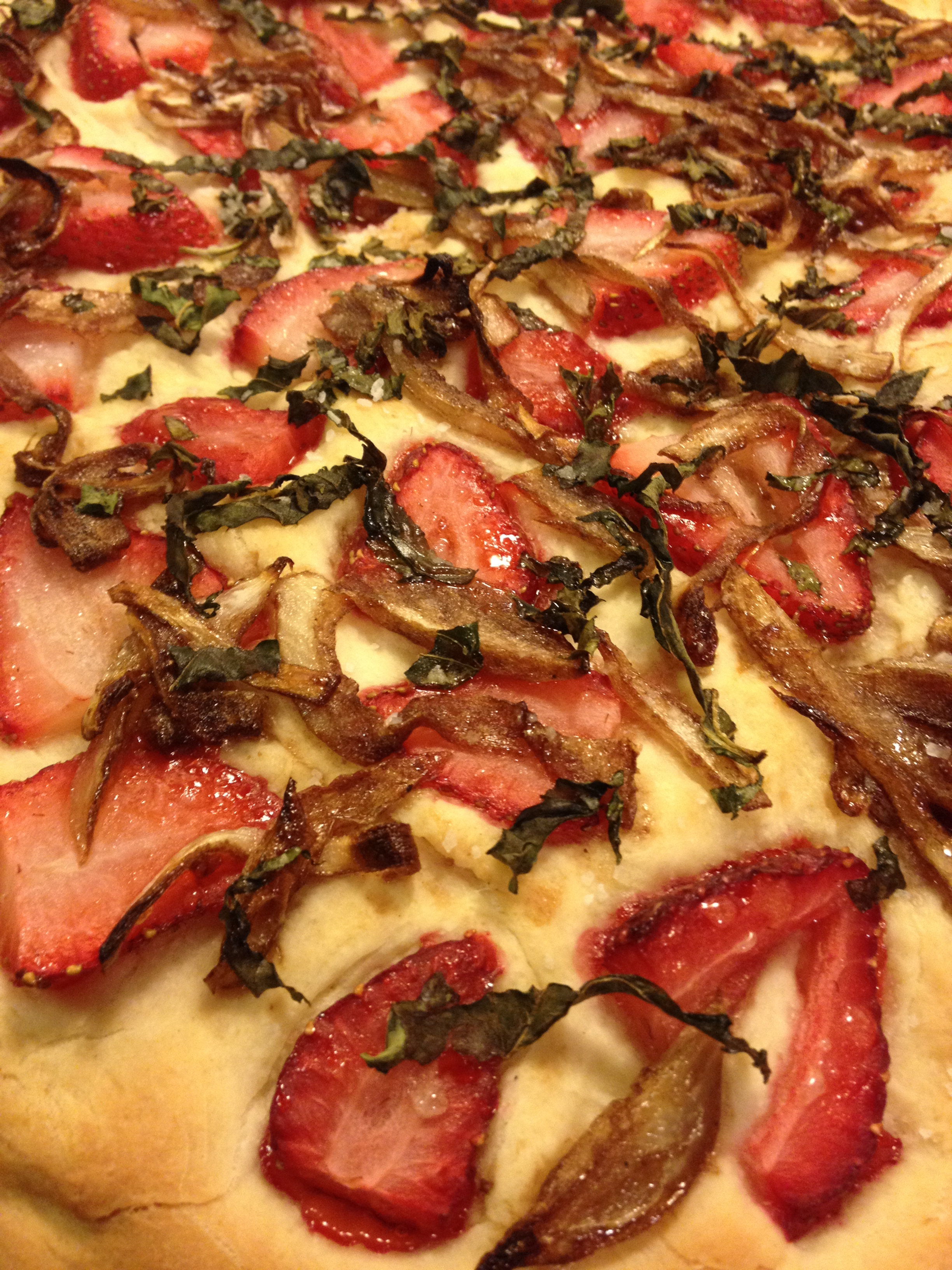 - Preheat the oven to 450 degrees F. Lightly press strawberry slices into the top of the dough, then scatter onions and basil evenly across the top. Drizzle remaining 1 tablespoon of olive oil over the top and sprinkle with sea salt to taste. Bake until the focaccia is golden, about 20 minutes. Remove from the oven and allow to cool slightly before cutting into pieces. Serve drizzled with more olive oil or spread with fresh goat cheese.