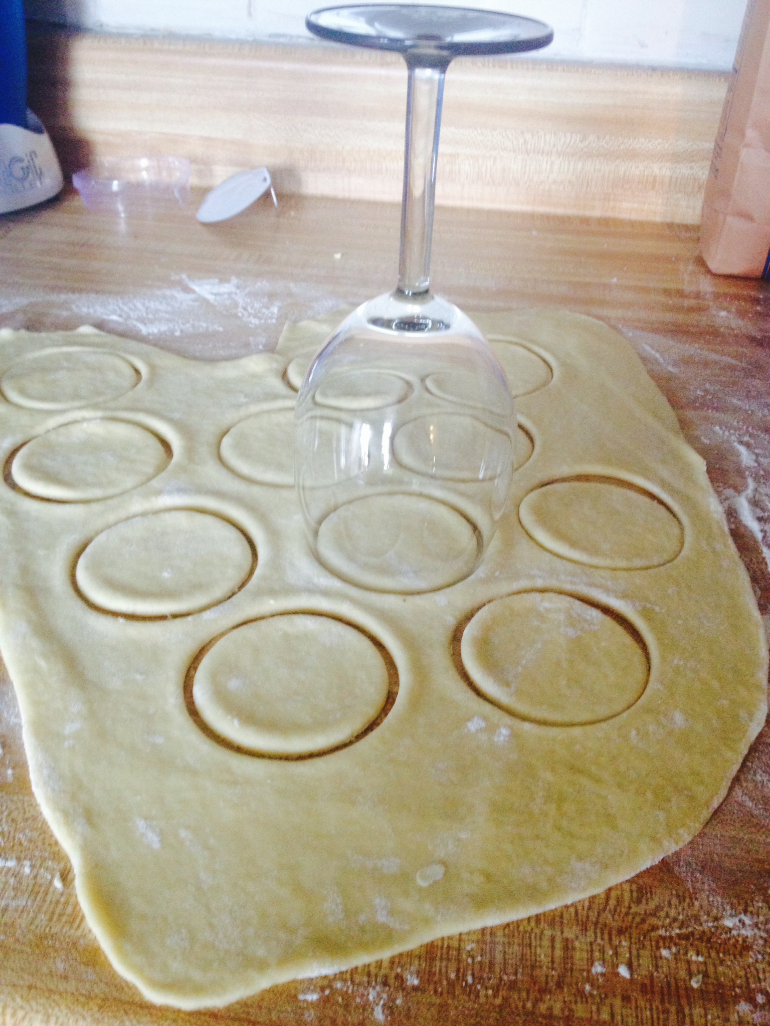 Making the dough was fairly easy. I didn’t have a biscuit cutter, so I used the top of a wine glass.