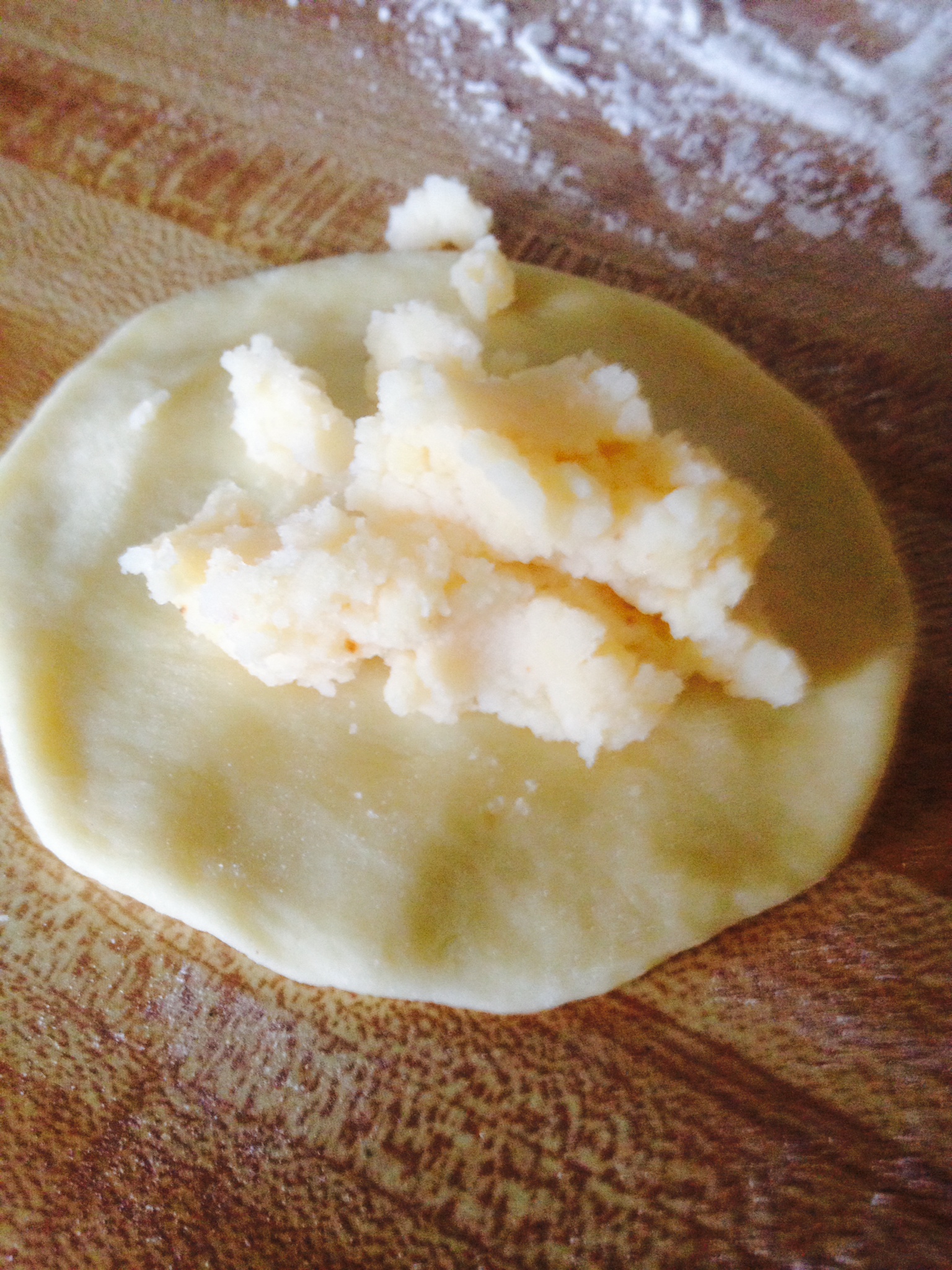 - Add about about a teaspoon of the potatoes and place it in the center of your round.