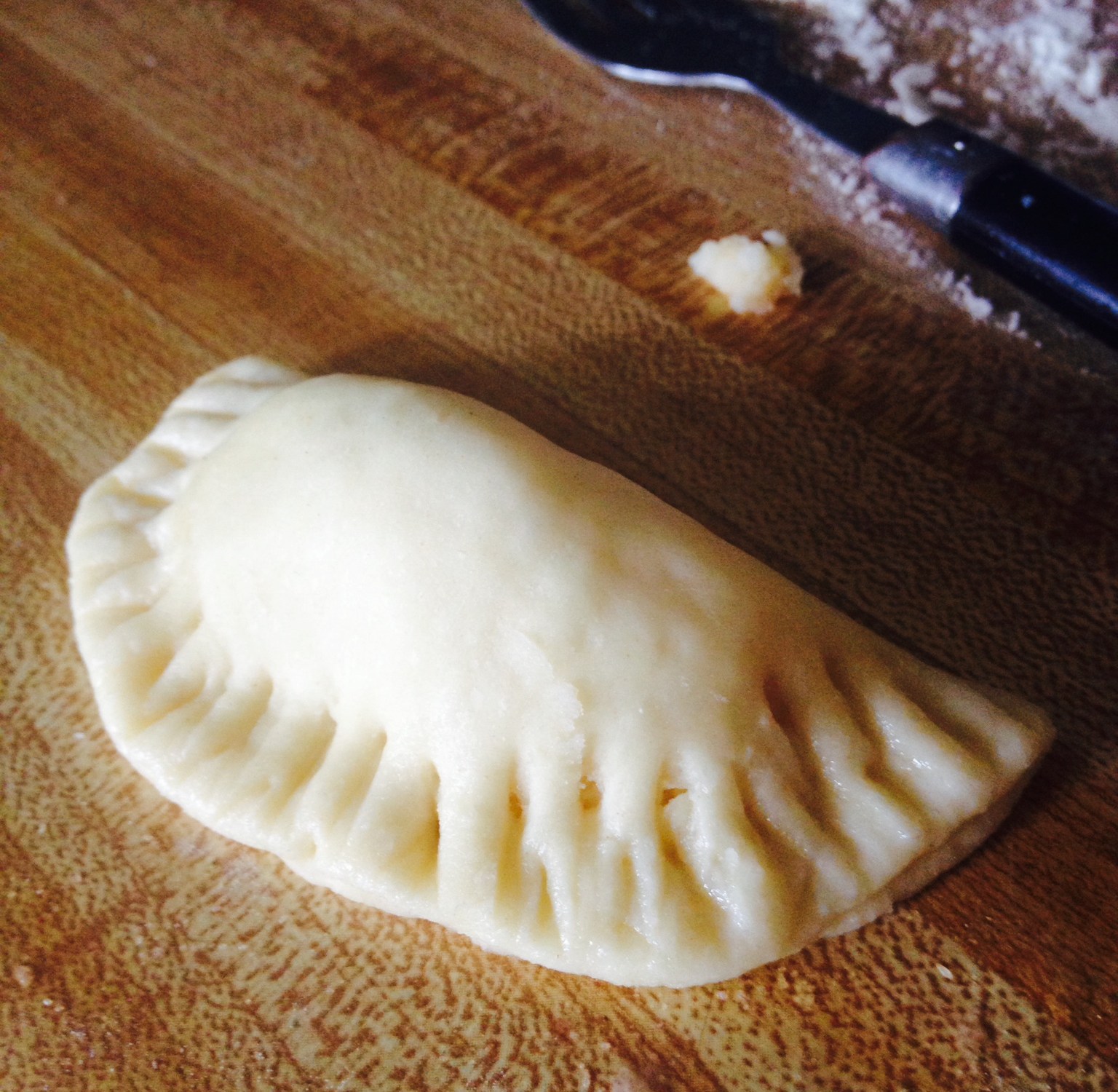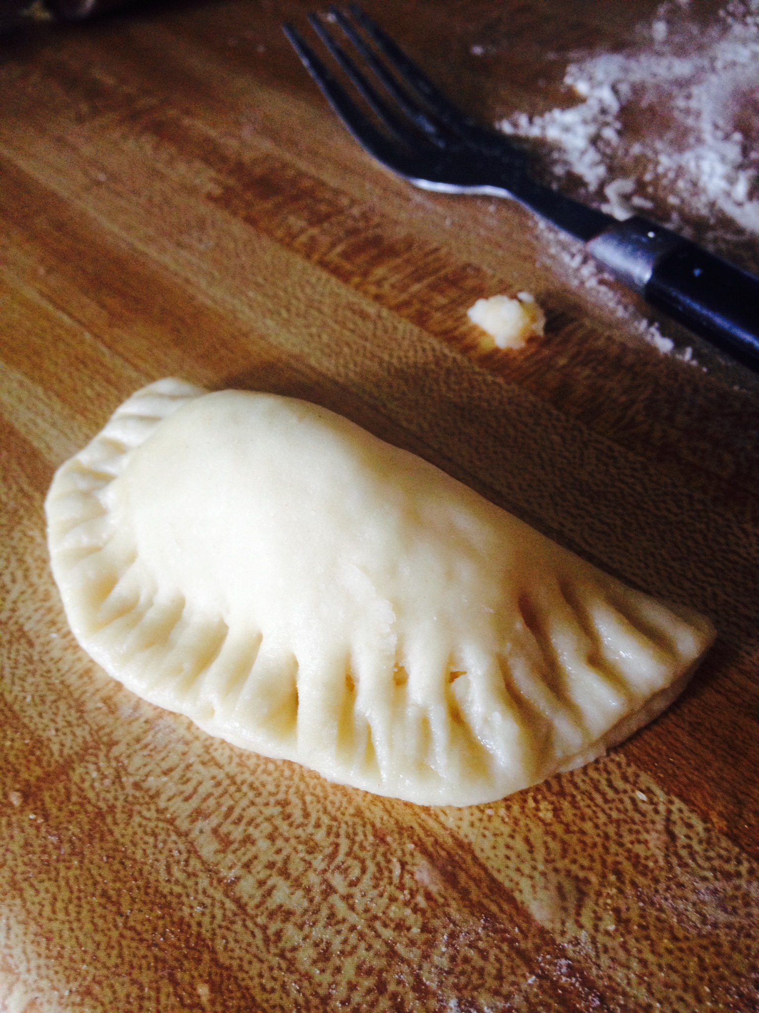 Pro tip from the lady at the grocery store that got excited when Tegan told her I was making pierogies: use a fork to seal the ends. Not only does it make it look more adorable, but helps the bond between the top and bottom part of the dough come together.