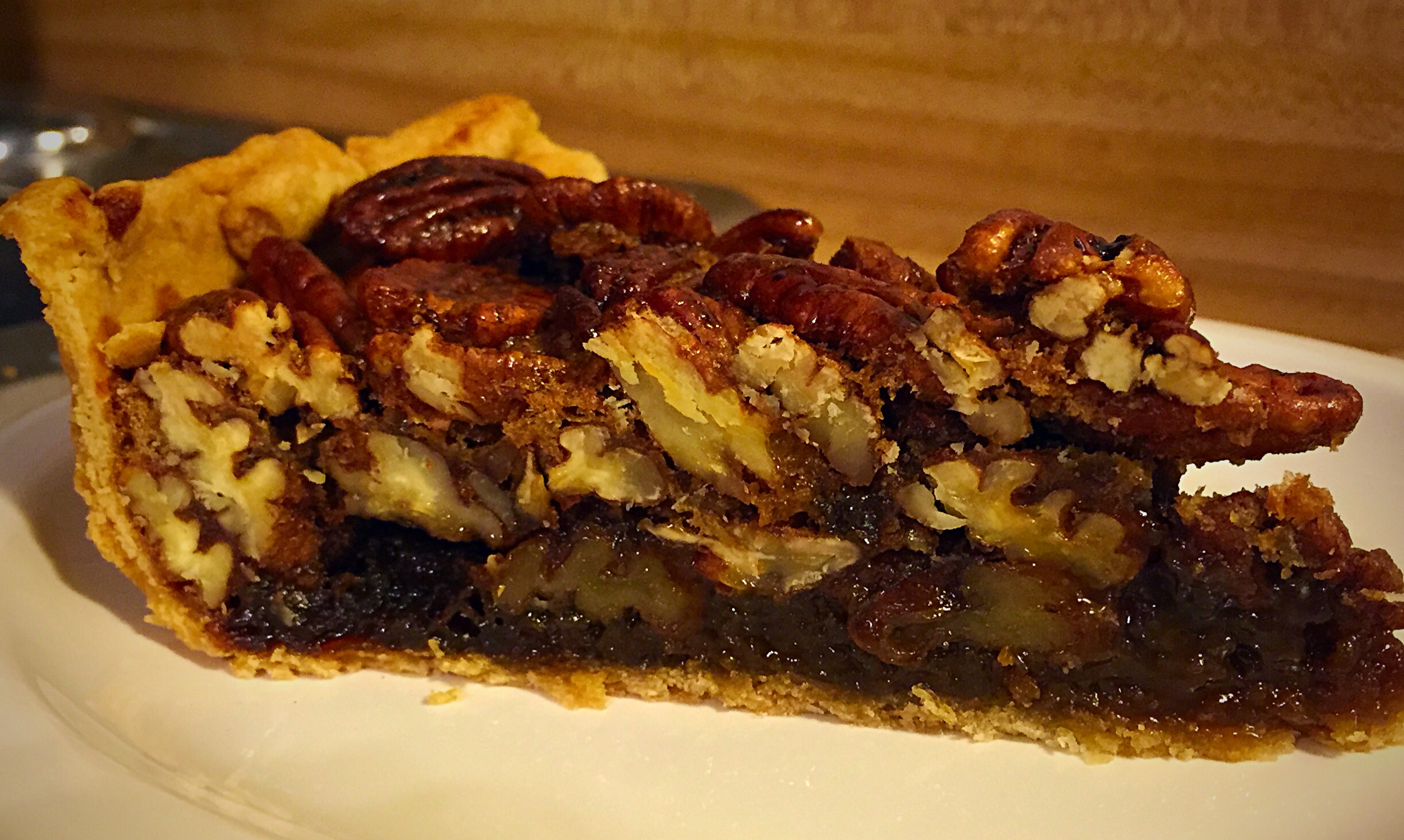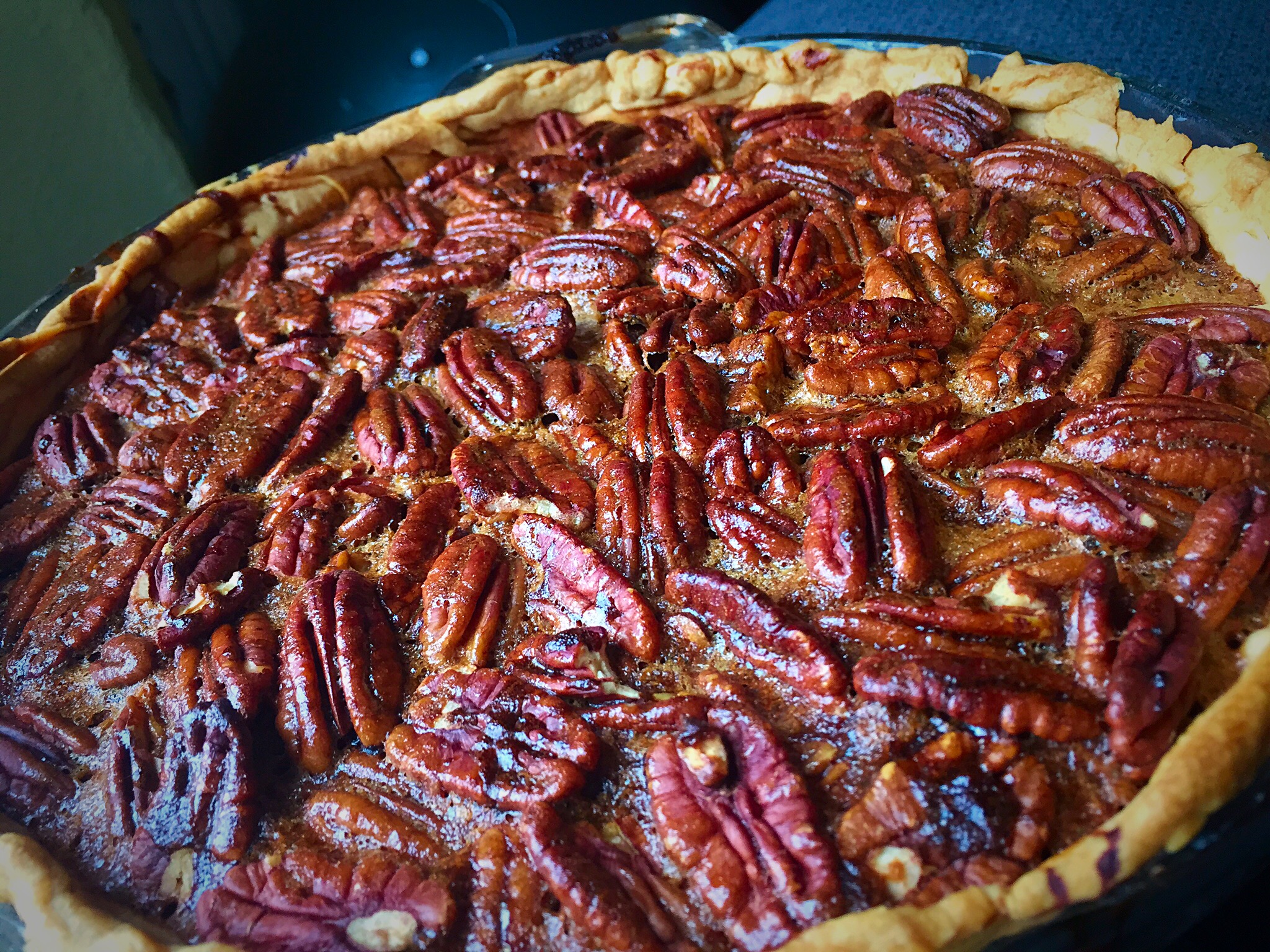- Fill the crust with pecans to the top and pour the filling over the top of the pecans.