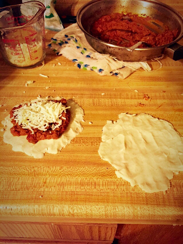 - Add all your cheese, beans, chorizo filling to the top of the tortilla that you just made and place aside.