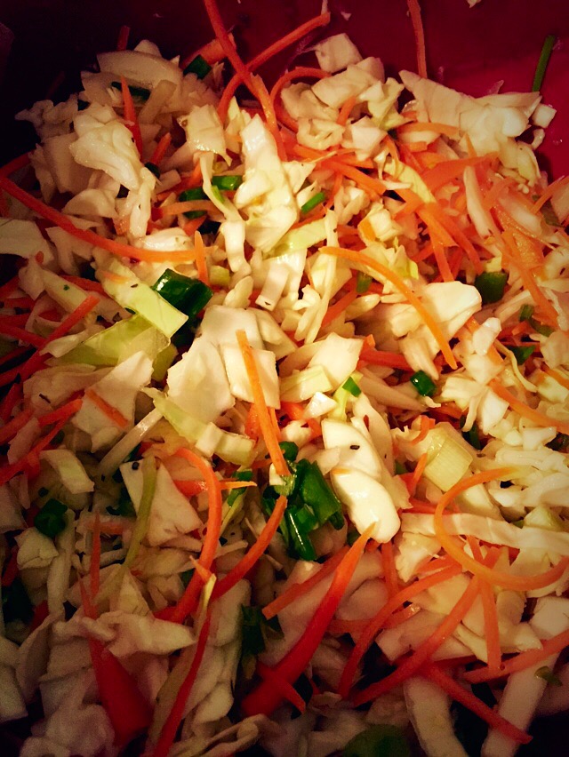 - Combine cabbage, onion, and carrot in a large mixing bowl.