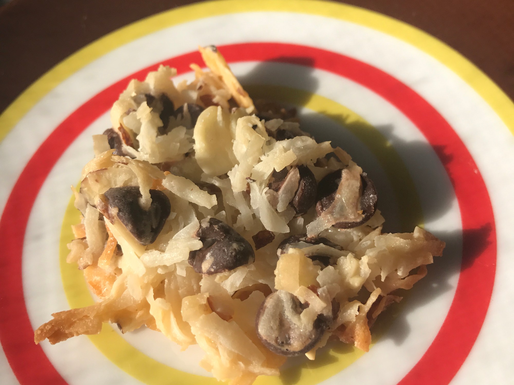 - Combine coconut, chocolate chips, almonds and sweetened condensed milk in a large bowl. Stir until all the dry ingredients are coated with the sweetened condensed milk.